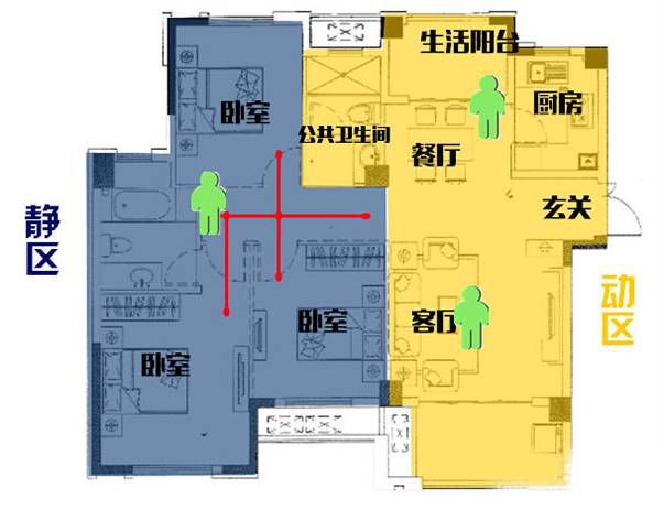 静区则指较少走动,需要相对安静、隐私的空间区域,包括卧室、书房、次卫等。