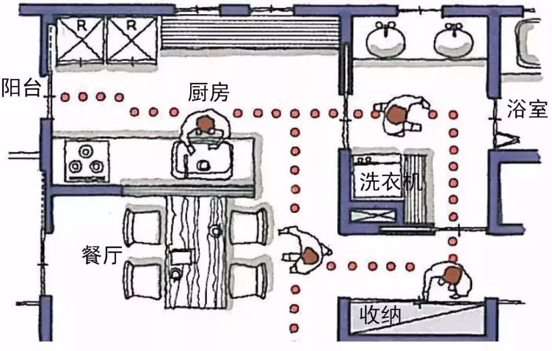 活动比较频繁的的区域应当尽量集中在一起,比如做饭一整套的活动(家务动线):