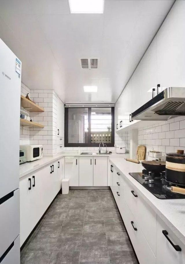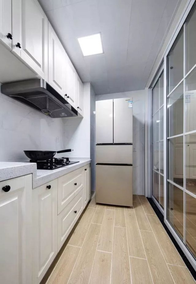 而有一些厨房外有阳台的户型,可以选择把厨房做双一字形的橱柜布局方案,这样动线也会更短,而且不影响日常通行。