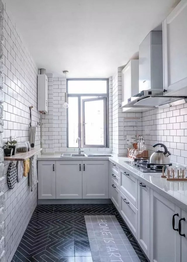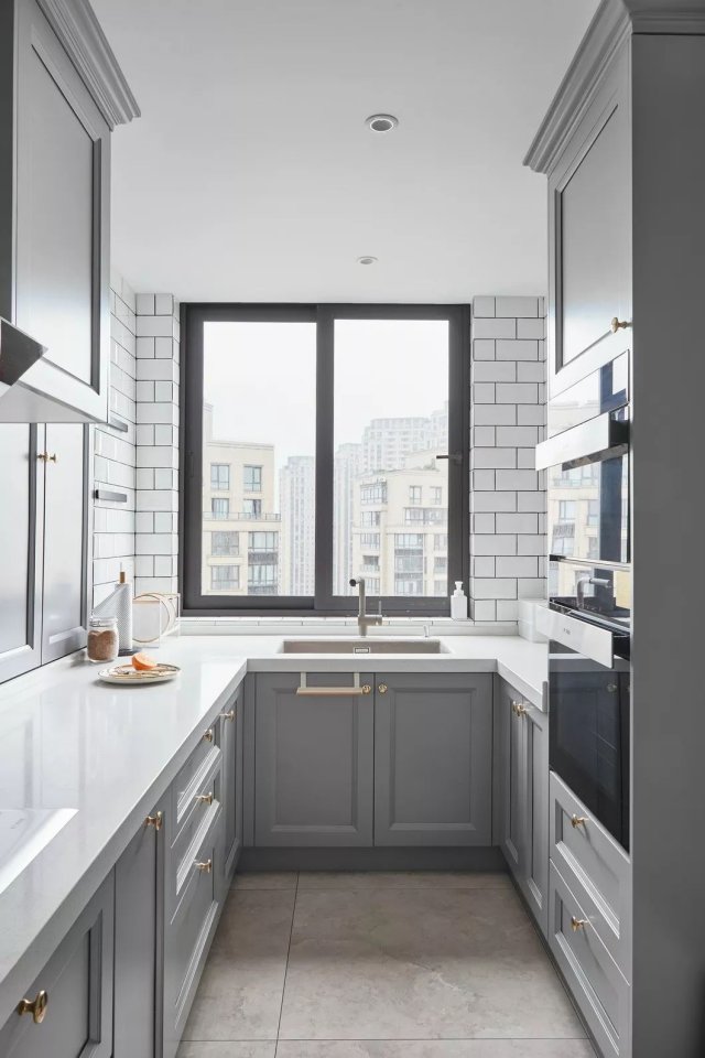 至于厨房面积更宽敞一些的,那就可以布置成U字形的橱柜啦~中间留下1~2人通行的空间即可,在U字形厨房内烹饪,通常只需要转身即可。