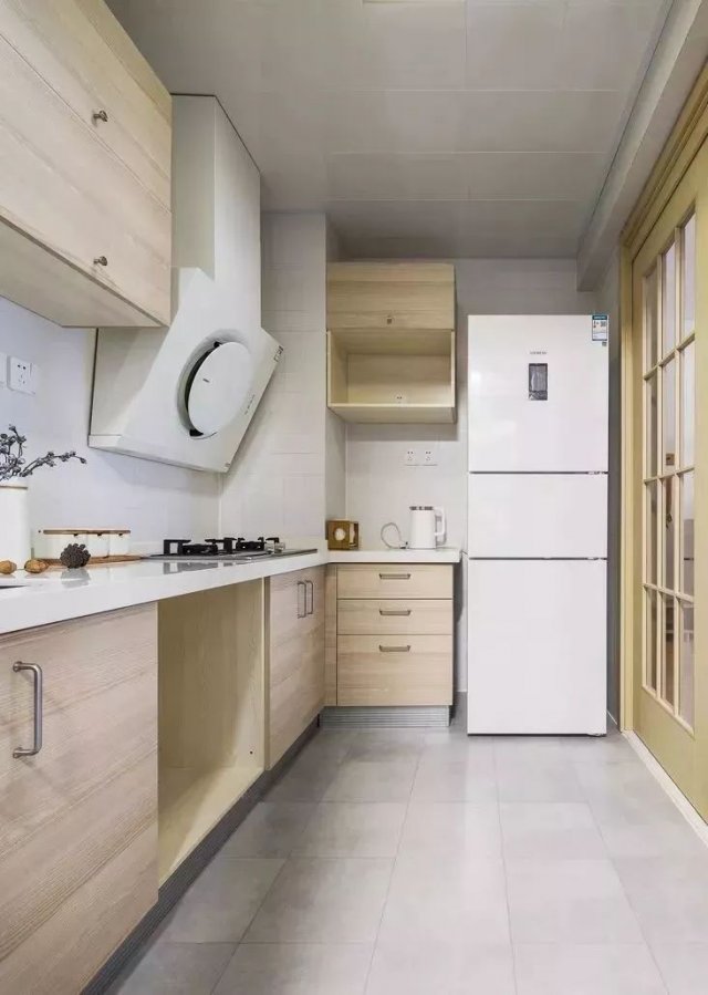 L形的橱柜多出了一个短边,所以收纳空间也会更多一些,冰箱同样是可以摆放在橱柜的边上。上图这样的木色橱柜搭配灰色、白色瓷砖的设计,非常好看。