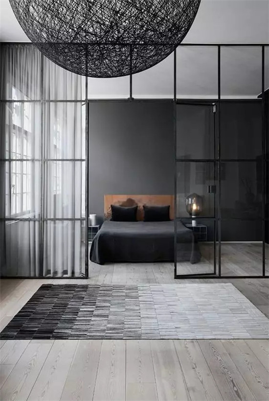 钛镁铝金的隔断门这两年非常火,黑色的铝金边框加上通透的玻璃,很好的做了阻断和通透空间的效果。用在卧室和客厅之间绝对不会出错,如果觉得太亮,在卧室内加一圈窗帘就可以很好的遮光啦!