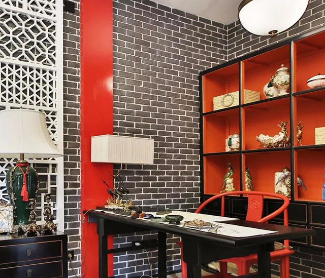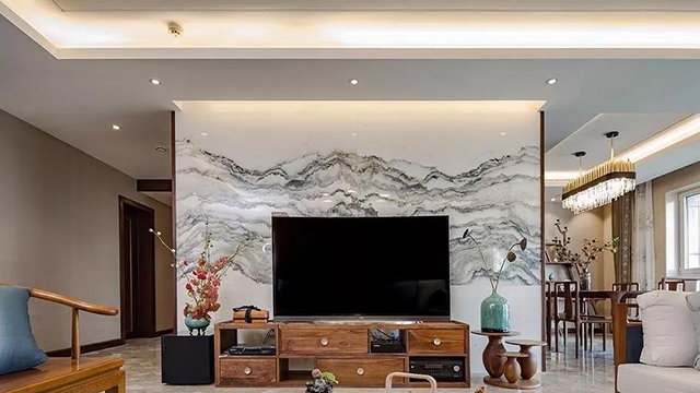 中式讲究对称,灵活嵌入花鸟虫鱼水墨画,博古架也是背景墙设计的首选,使空间更加丰富。