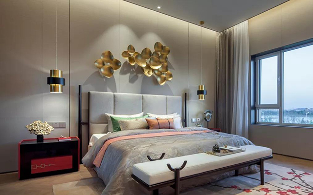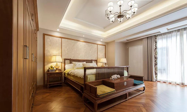 卧室在色彩方面秉承了传统风格的典雅和华贵,呈现着时尚的特征。在配饰的选择方面更为简洁,少了许多奢华的装饰,更加流畅地表达出传统文化中的精髓。为了给居室增添几分暖意,饰以精巧的灯具和雅致的挂画,使整个居室在浓浓古韵中渗透了几许现代气息。