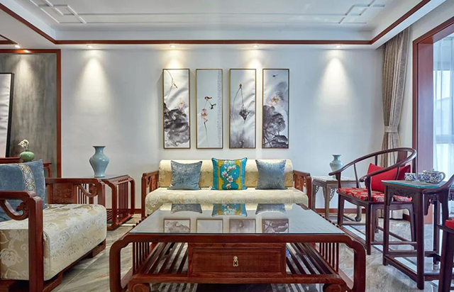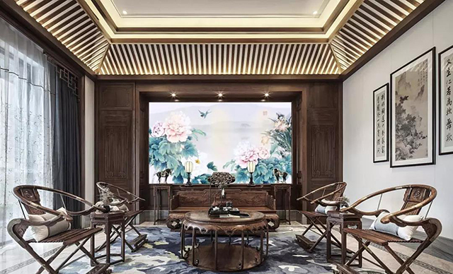 中式客厅,天花以木条相交成方格形,上覆木板,也可做简单的环形的灯池吊顶,用实木做框,层次清晰,漆成花梨木色。随着设计元素的变化,渐渐的就只简单的弄个石膏线或者平顶。沙发背景画多选择水墨字画,家具多以木质为主。
